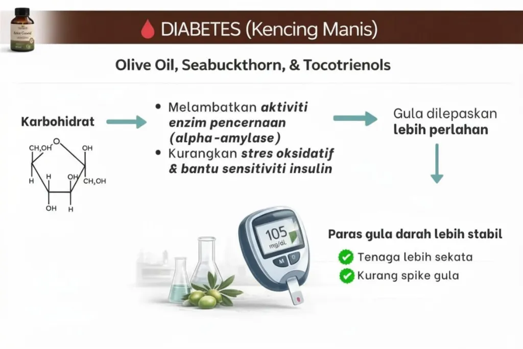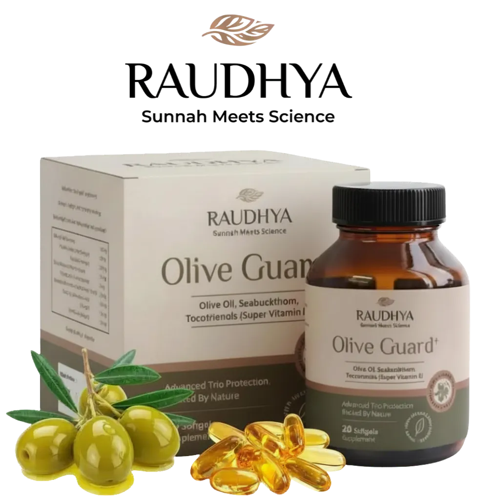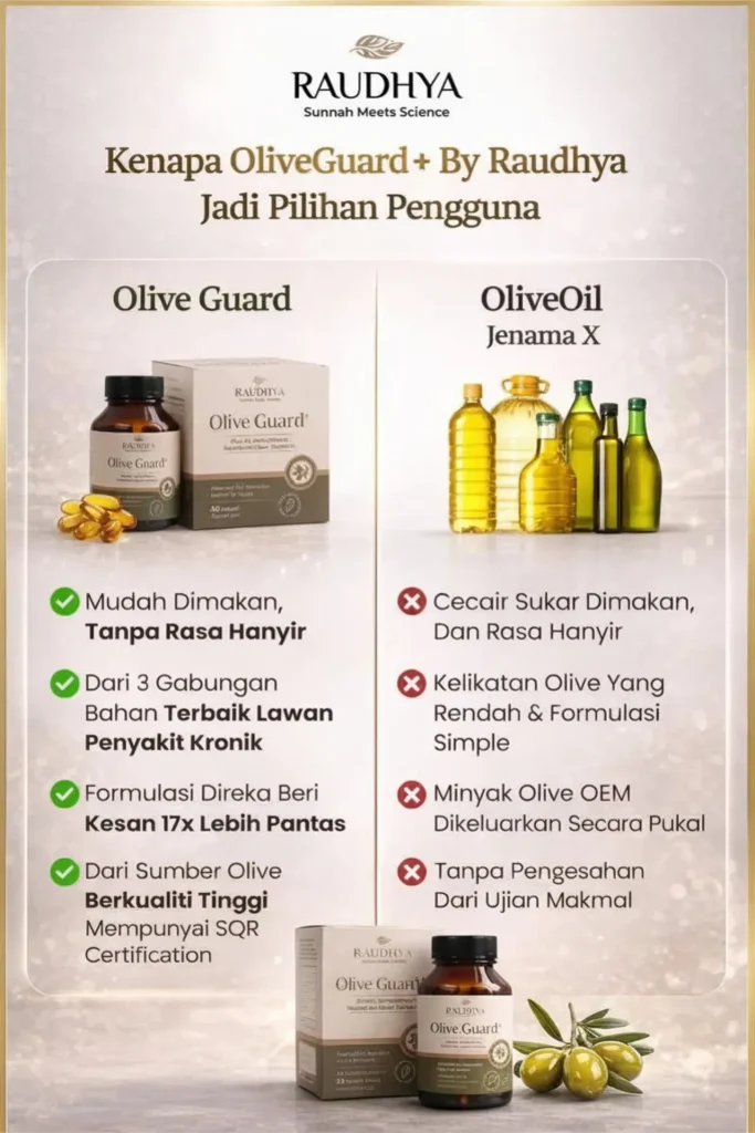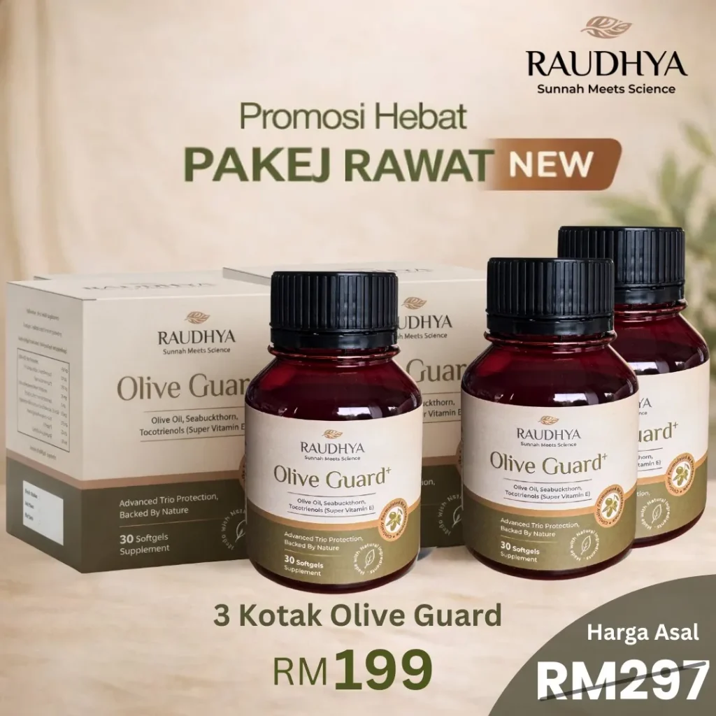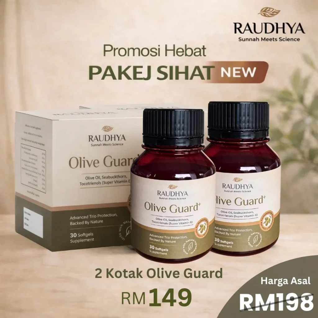Raudhya OliveGuard+ Diperkaya Bahan Aktif Polyphenols, Tocotrienols (Super Vitamin E) & Omega Aktif Menyokong Kawalan Gula, Kolesterol & Tekanan Darah