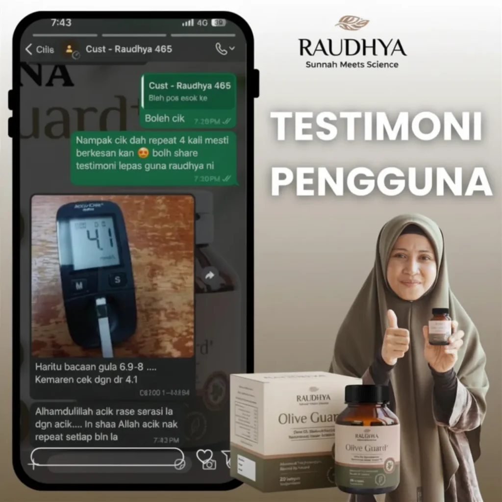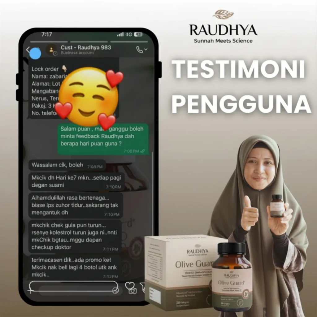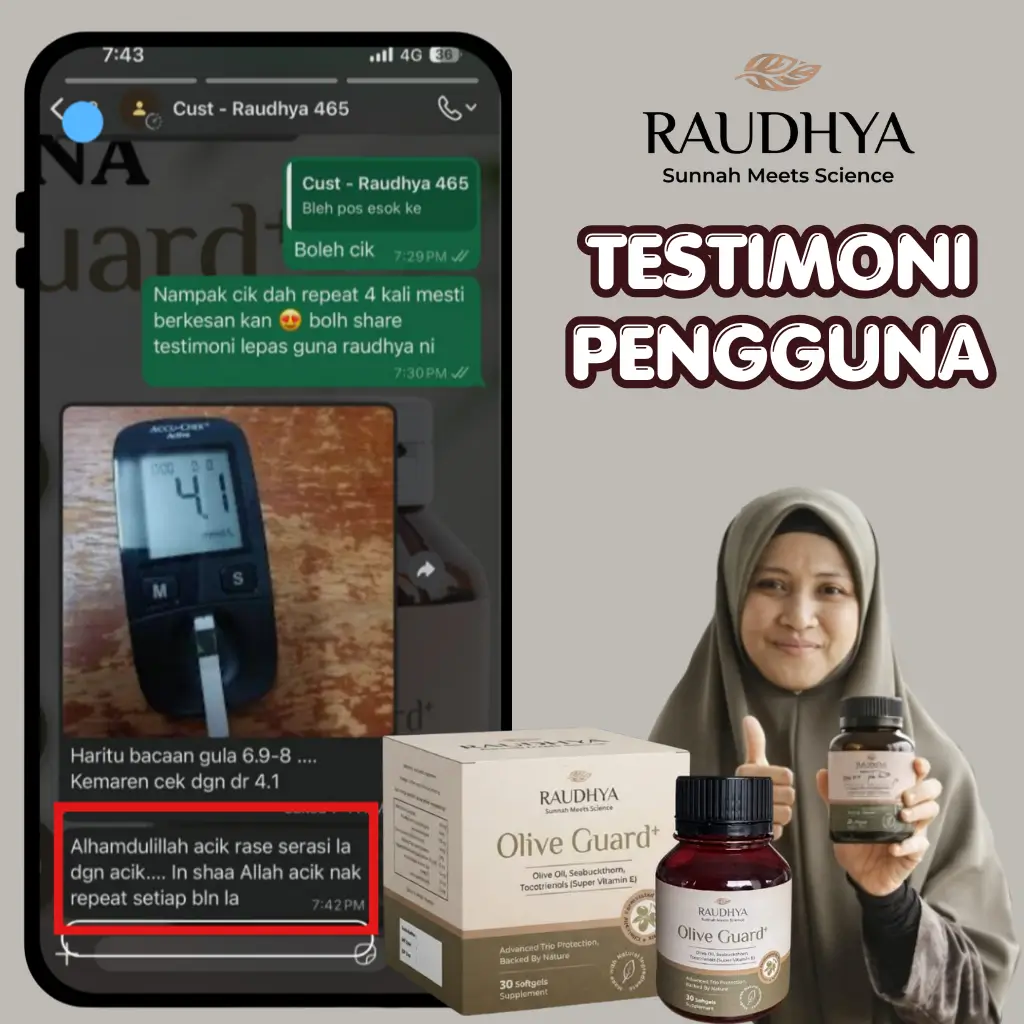 “Lepas 2 minggu ambil Olive Guard+, badan rasa lebih ringan dan kolesterol makin terkawal.”