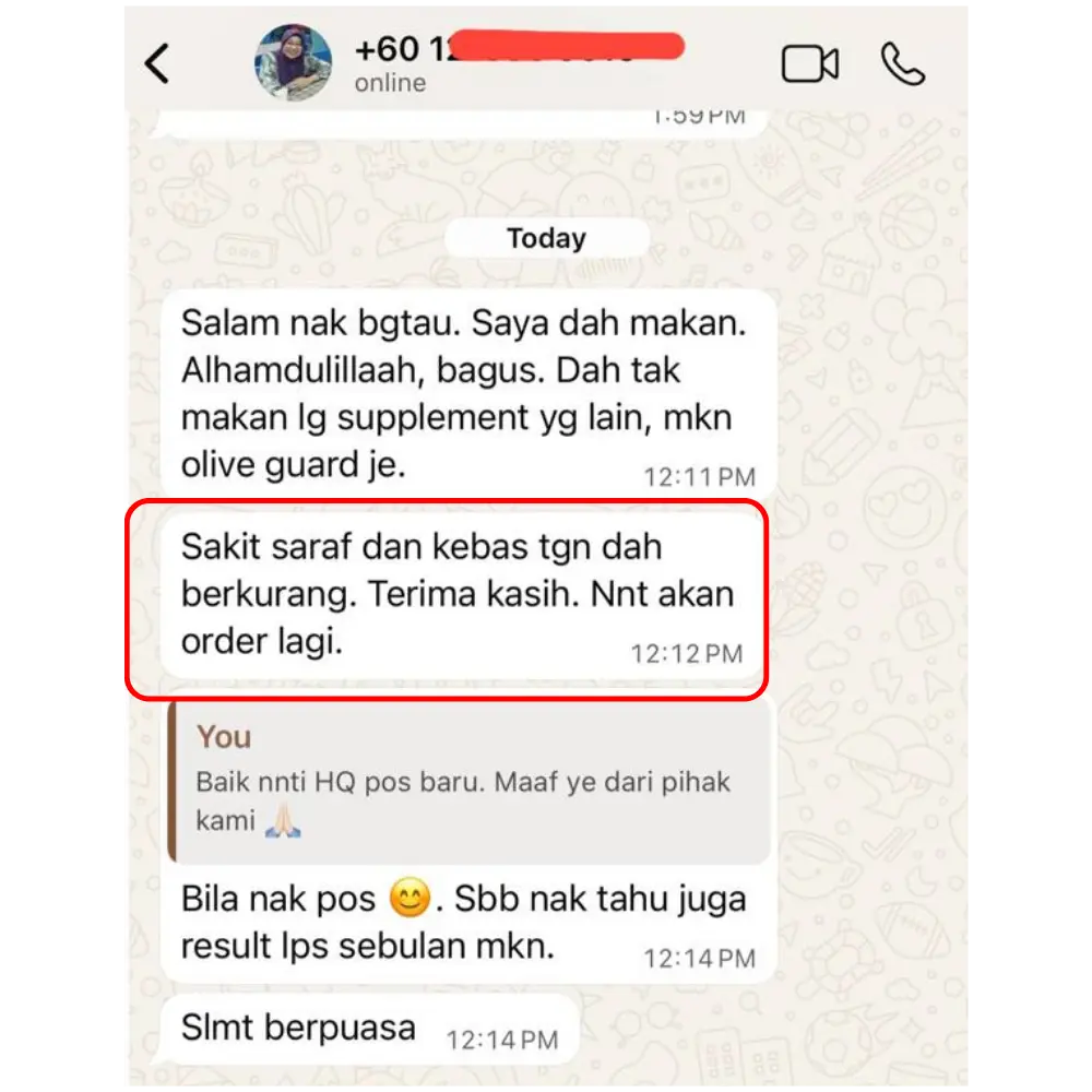"Baru hari ke-3 dah dapat rasa kesan baik Olive Guard+. Sakit-sakit badan kurang, badan makin bertenaga."